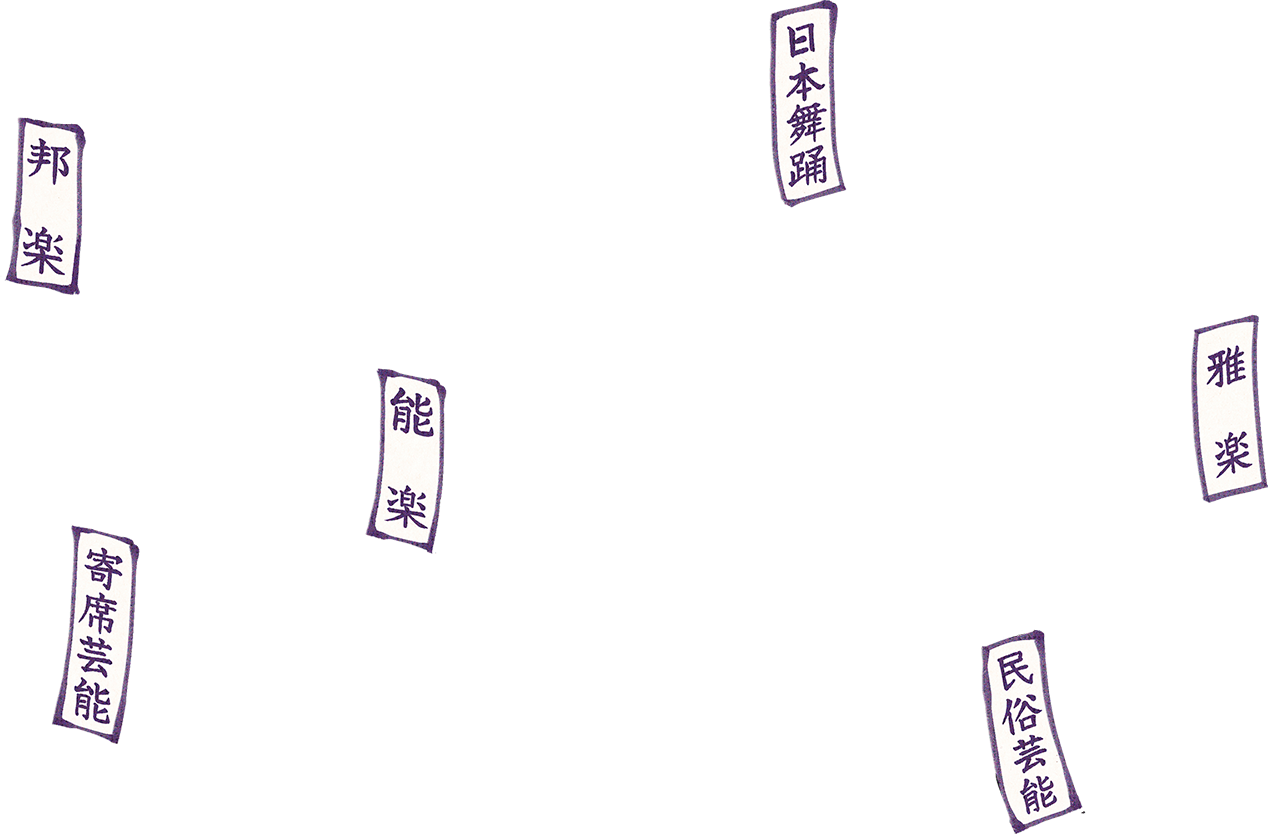 能楽、歌舞伎、日本舞踊、邦楽、雅楽、寄席芸能、民俗芸能など、
