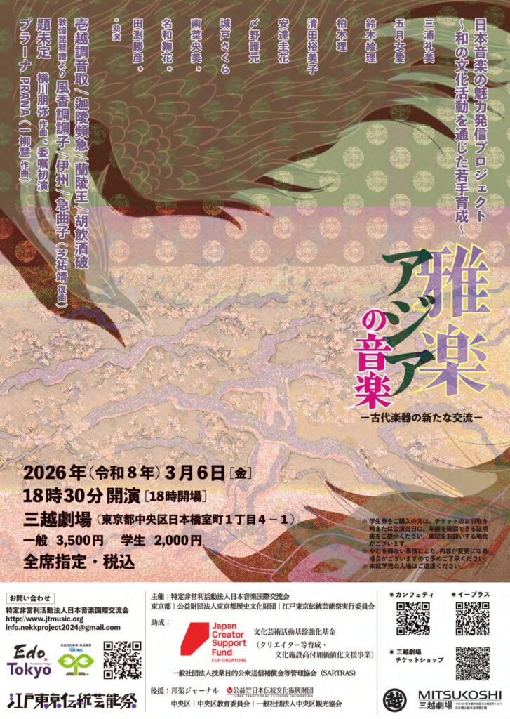 かつては民衆の芸能ではなく、宮中や寺社で式楽として演奏されていた雅楽。現在では、劇場をはじめ、さまざまな場所で楽しめるようになりました。2026年3月6日には「江戸東京伝統芸能祭」の一環として、三越劇場で「雅楽・アジアの音楽 ~古代楽器の新たな交流~」が予定されており、雅楽を聞いたことがない方も、その魅力に触れるチャンスです!お見逃しなく!