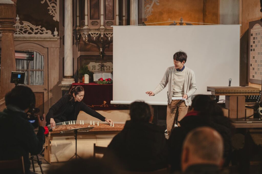 2025年のコンサートより。箏の菊地奈緒子さん・解説する橫川さん